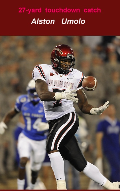 Other Aztec standouts included Brandon Davis (97-yard kickoff return for touchdown), Quarterback Ryan Lindley (15 for 21, 209 yards, 2TDs) and tight end Alston Umolo, whose 27-yard TD grab is pictured below.