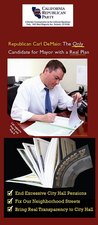 The California Republican Party, following the lead of the San Diego GOP, is launching a direct mail effort to aid Carl DeMaio’s race for Mayor. The sample you see above is expected to hit mail boxes this week. The timing is major since the SD Registrar of Voters soon begins its vote-by-mail program as dictated by State law. Based on past primary elections, your correspondent anticipates well over 50 percent of the votes will be cast by mail. As the saying goes among political pros, once that starts, “Every Day is Election Day.”
