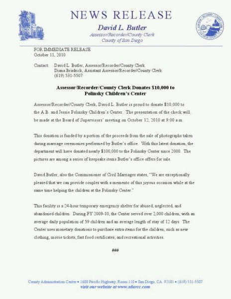 “Assessor/Recorder/County Clerk, David L. Butler is proud to donate $10,000 to…”