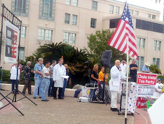I attended the Anti-Tax Rally today in downtown San Diego held in front of the County Administration Building. Brian Bilbray was clearly the most famous speaker invited. He is in a competitive district, as I have previously discussed. The rally started with doctors in white lab coats speaking about the harm done to health care under the law. Doctor Gary Gonsalves led off the doctors’ segment. (It seems that Obama’s stunt at the White House has made it de rigueur to put the docs in lab coats.)
