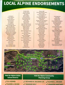 Even more disturbing, I was surprised to see another mailer (pictured here) that claims the candidates listed on the flyer were endorsed by 115 local families who are well known in Alpine – and then lists each of the families. However, a number of people on this list have clearly indicated they never gave permission to be on a political circular.