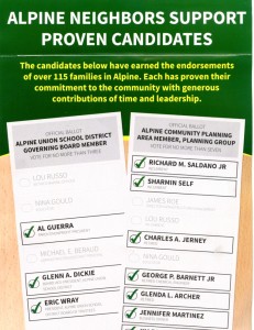 A large (8.5″ x 14″) 2-sided, 4-color hit piece was mailed to presumably all the registered voters in our school district precincts. The pamphlet lambasted a candidate who is running for the Alpine Union School District School Board. To the best of my recollection of living here for over 20 years, this very professionally produced negative ad is the first to target an individual.