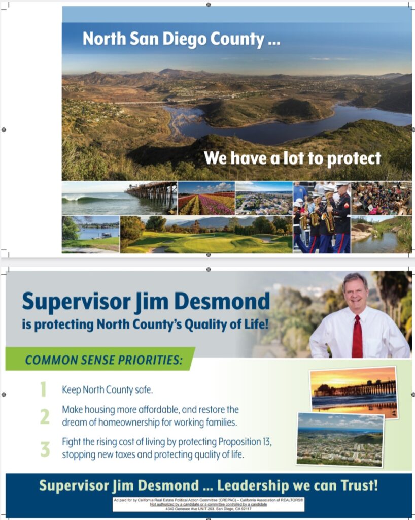 “A Quality of Life Worth Protecting”, a direct mail piece promoting the reelection of Supervisor Jim Desmond, and paid for by the California REALTORS Association’s CREPAC, has been chosen as a finalist for Best Direct Mail Piece of 2022 in the category of independent expenditures for a local, county or judicial campaign.