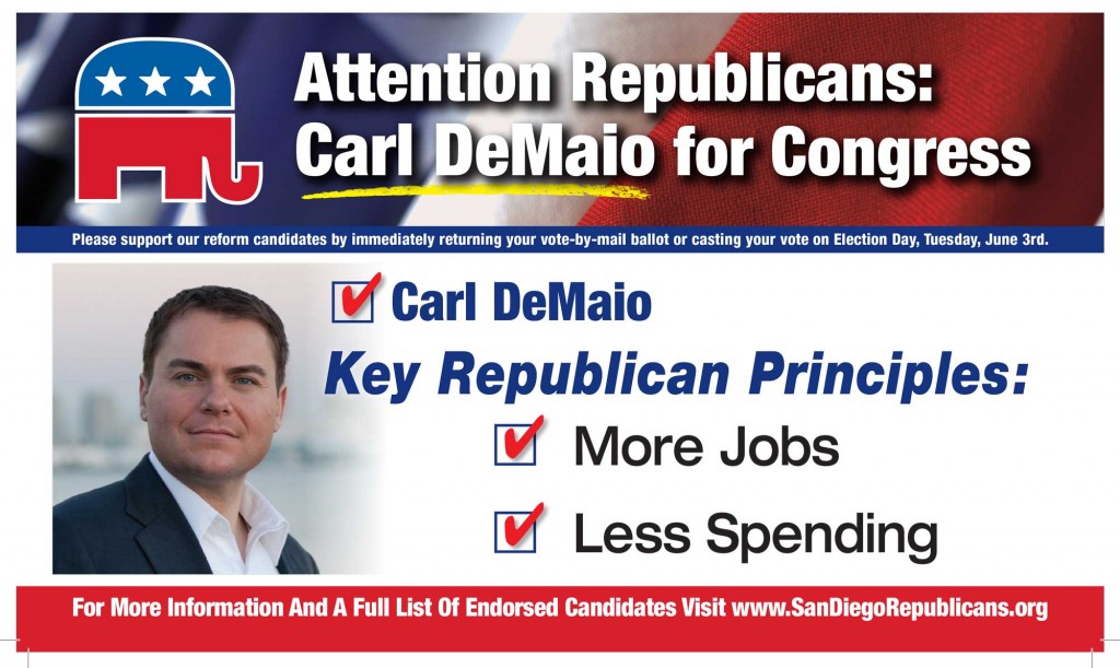 Coming soon to a mailbox near you… Carl DeMaio May 3, 2014Carl DeMaio Leave a Comment The first slate mailers of the season are on their way to a mailbox near you. Check it out: