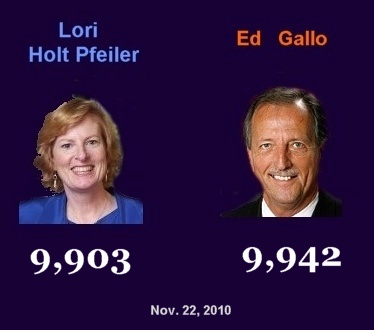 In a race which stretched 3 weeks beyond election day, conservative Ed Gallo has taken a decisive 39-vote lead over 18-year incumbent Lori Holt Pfeiler for the final undecided Escondido council seat.