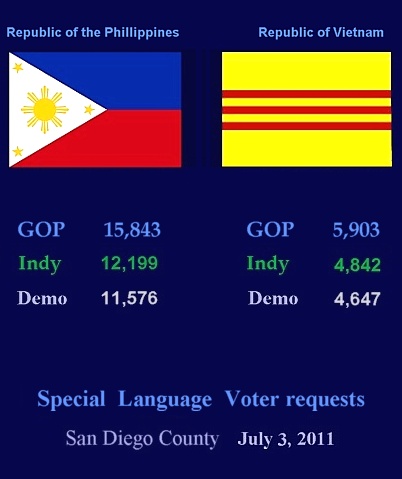 Two ethnic groups with growing power (Filipinos and Vietnamese) are breaking bad for Democrats in San Diego, a new report reveals this week . Figures in the above chart are from a novel SD Registrar of Voters study, combining requests for foreign-language ballot materials with other ethnic identifiers. The high impact of Fil-Am voters in the South Bay, and Mira Mesa, makes them critical to (a) Supervisor Greg Cox’s re-election bid in District 1, and (b) filling the new “9th district” San Diego Council seat. Republicans not only lead with both of these rising powers, but their Democratic rivals are now stuck back in 3rd place, behind Non-partisan / Independent voters !