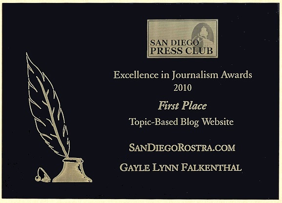 As Gayle explained, a Press Club in another city of similar size did the San Diego judging, to eliminate bias as much as possible. Ms. Falkenthal did the tedious paperwork for our entry, summarized examples of news-beats first published here, and then invited the judges to visit SD Rostra on the web and draw their own conclusions.
