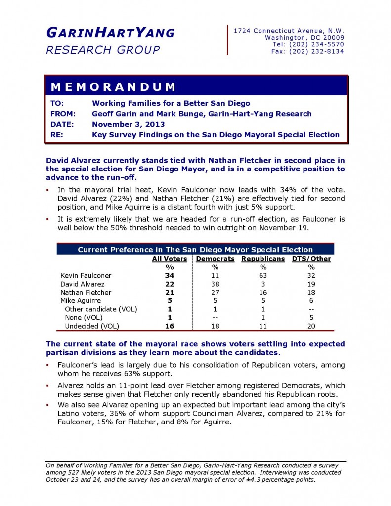 A recent Garin-Hart-Yang survey, shown below, shows David Alvarez slightly ahead of Nathan Fletcher for the second spot in the San Diego mayor’s contest.