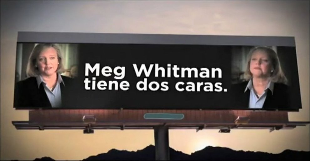 In English, “Met Whitman Has Two Faces.” That’s on a Spanish-language billboard ad from Jerry Brown’s campaign, pointing out how post-primary Whitman is saying different things than pre-primary Whitman on issues like illegal immigration and halting AB 32, California’s strict global warming law.