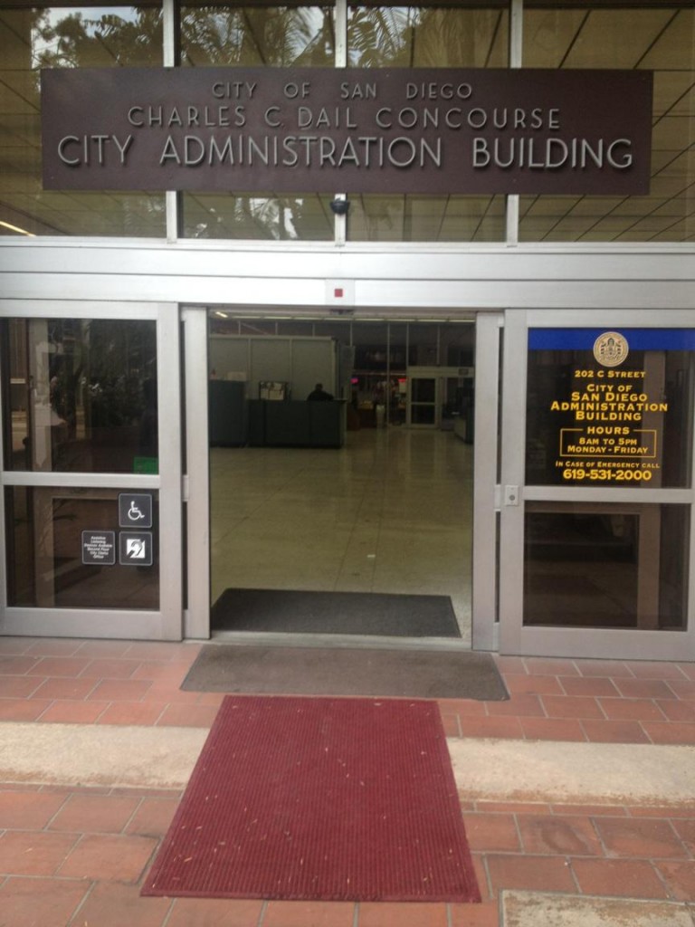 The reason for the slightly worn “red carpet” adorning the Third Avenue entrance to San Diego City Hall yesterday? That’s not exactly clear, although it must be to the culprit that placed it there.