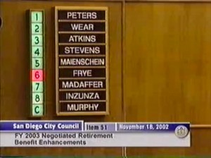 And back to your point that simply by voting for the annual budget, Peters was complicit in voting for pension spiking: If that is your contention, then you must agree that every previous Council Member and Mayor were equally complicit. I would like you to tell Pete Wilson that he is responsible for pension spiking or, even better, go on the Roger Hedgecock show and tell the host that it is his fault.