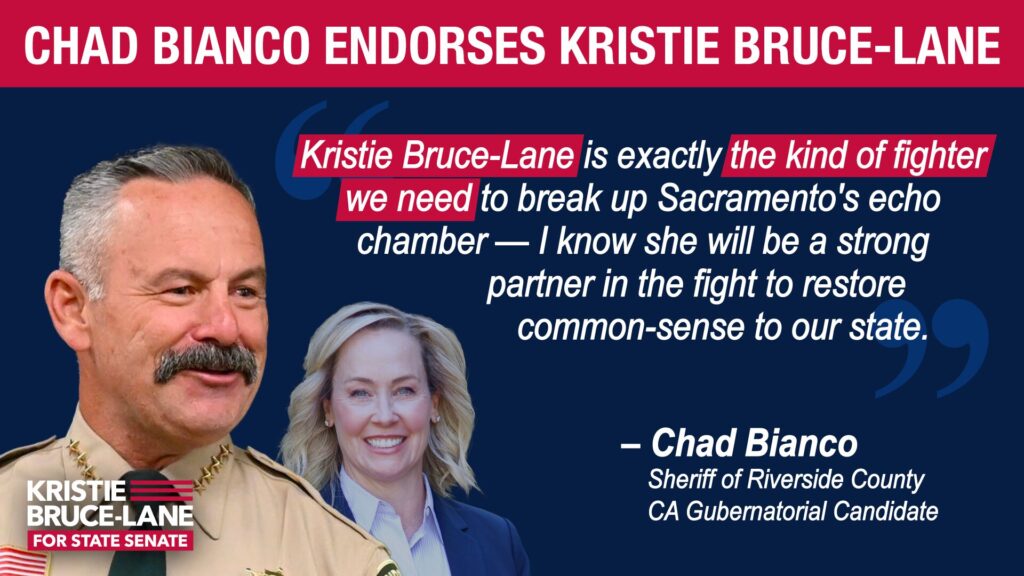 Riverside County Sheriff and 2026 California gubernatorial candidate Chad Bianco today announced his endorsement of Kristie Bruce-Lane for California State Senate District 40, citing her commitment to restoring law and order, securing the border, and fighting government waste.