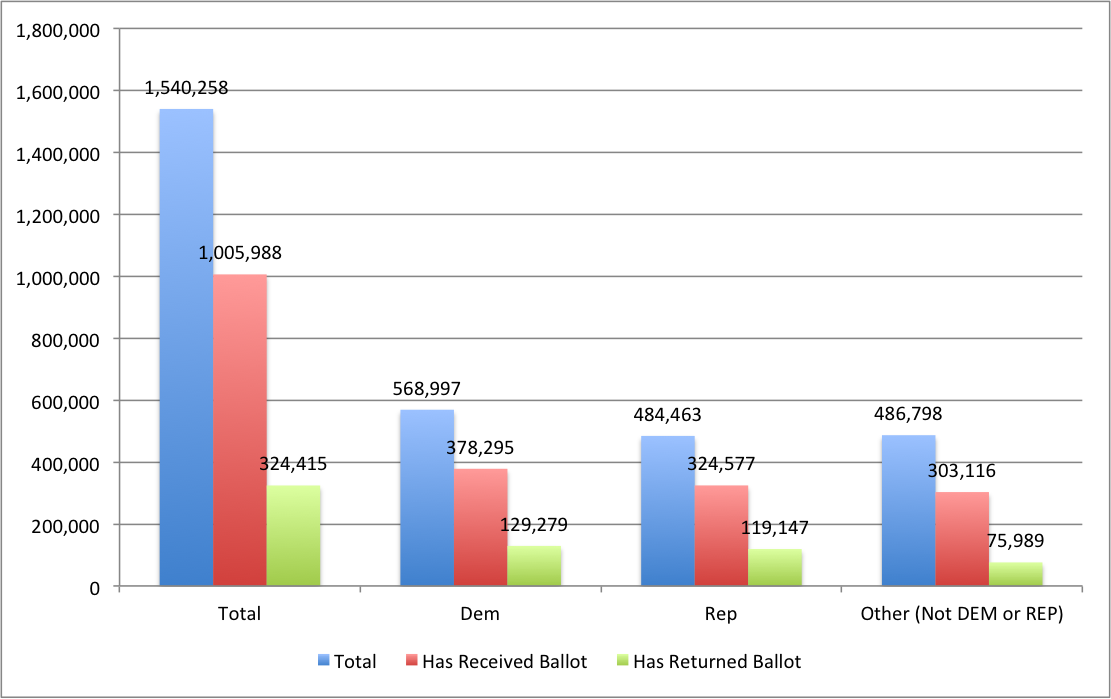 As of November 1, 2016 at 5:00pm, 1,005,998 ballots have been mailed to registered voters throughout the county. 324,415 voters have voted (either by returning their ballot, or through early voting).